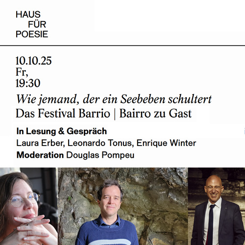 Zweisprachige Lesung & Gespräch mit Laura Erber, Leonardo Tonus und Enrique Winter im Rahmen des lateinamerikanischen Festivals Barrio. Am 10.10.2025 im Haus für Poesie, Berlin.